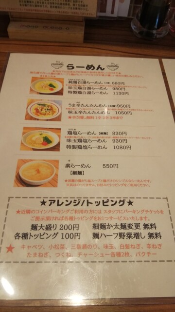 メニューは、ラーメンは、大きく分けて鶏白湯、鶏塩、タンタンメンの3種類で、サイドメニューで、馬肉や鶏肉のご飯などがあります。