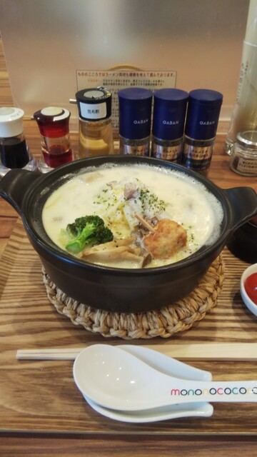 スープは、土鍋に入った上に、スープの表面のチーズがフタの役割りを果たして、最後までうれしい熱々、身も心も温まります。雑味なく、鶏の旨味たっぷりなのは、もののこころの通常の鶏白湯譲りです。