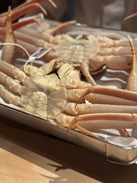 初セリで落とされた松葉蟹。4分30秒茹でた蟹が、花鳥風月のお皿で登場。蟹にも初セリがあることは知らなかったです。
