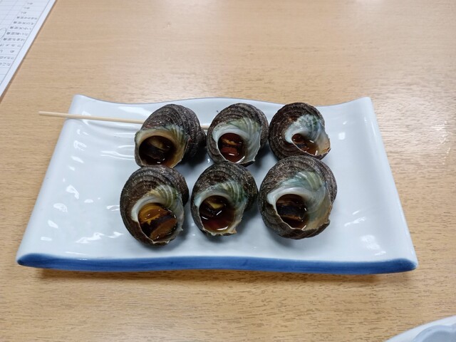 頂いたのは「鯛の刺身定食」と「さざえのつぼ焼き」。少し待って刺身定食が到着。大ぶりの切り身から、結構大きなサイズの鯛なんだろぉなーというのが想像できます。ワカメたっぷりな味噌汁と、海藻の酢の物、香の物が付きました。そして、少し遅れてサザエのつぼ焼きも到着です。こちらは想像とは違って小ぶりで、ばい貝みたいな感じですね。