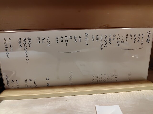 「つくね」タレ1、「うずら」塩1、「とりわさ」「かき釜めし」を注文。