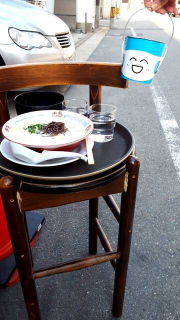 「この辺だったような」と駐車場に止めるとどことなく香ってきた豚骨臭。まさかの匂いでたどり着けた14時前。かわいい青色のバケツが吊るされている!暖簾のようなもんなんだろうか。