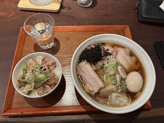 貝出汁特製しじみらぁ麺 麺を+100円で中盛にして、トッピングにバラ肉(3枚)300円と肉炙りご飯300円を