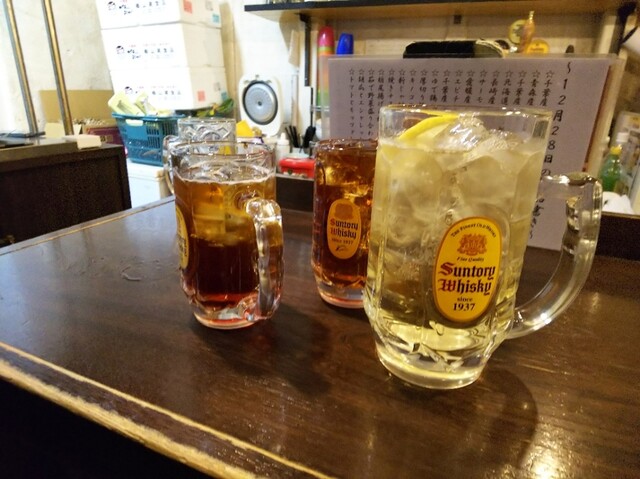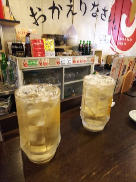 昼に2杯のラーメンを食べた後、金町湯でリフレッシュしてから金町製麺へ。まずはメガハイボールで乾杯です。