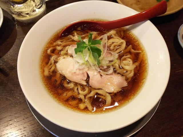 刺身はホッキ貝、大阪のイワシ、アジの酢〆、岩手県産鰤、カツオなど。当然日本酒が飲みたくなり、「山本熊本産神力」をオーダー。熊本復興のために作られた日本酒とのこと。食べ物はあん肝ポン酢、北海浅利と根三つ葉の出汁蒸しを追加。出汁蒸しはじんわりうまい。根三つ葉ってはじめて食べましたが、味が濃くて日本酒に合います。さらに日本酒の「紀土あがらの田で育てた山田錦低精米」、「みむろ杉山田錦純米吟醸」を飲んだあと、いい感じで酔ってきたところで肉を喰らってから、〆のラーメンタイムに。今回は雉二種の食べ比べ。まずは醤油です。
