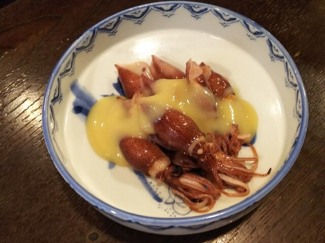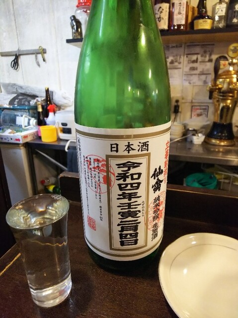 食べ物は刺身盛から。刺身は銀鮭、イワシ、スルメイカのラインナップでスルメイカは肝つき。肝はコクが強く、日本酒が欲しくなる味。ということで日本酒へ。日本酒は「仙禽さくら」から。春らしい爽やかな酸味のあるお酒です。