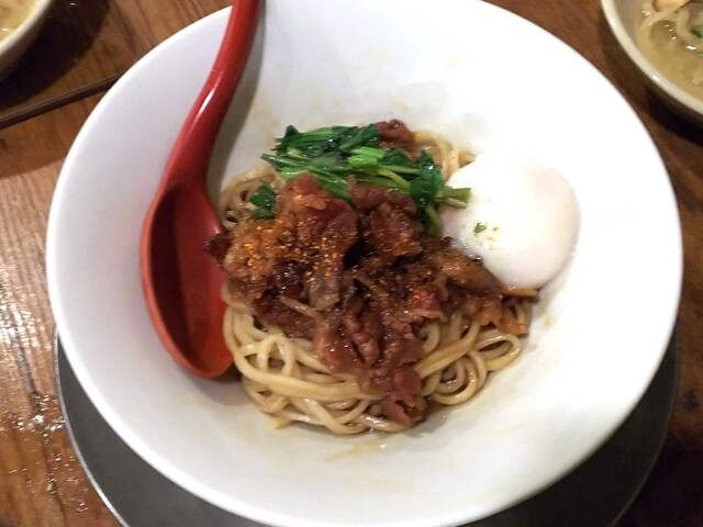 続いて、煮干の和え麺。こちらはネーミングの通り、煮干がガッツリと効いており、ベースは醤油。煮干しの香りがあるので、こちらは日本酒や緑茶ハイに合いそうな味です。具は牛チャーシューと紫タマネギ。