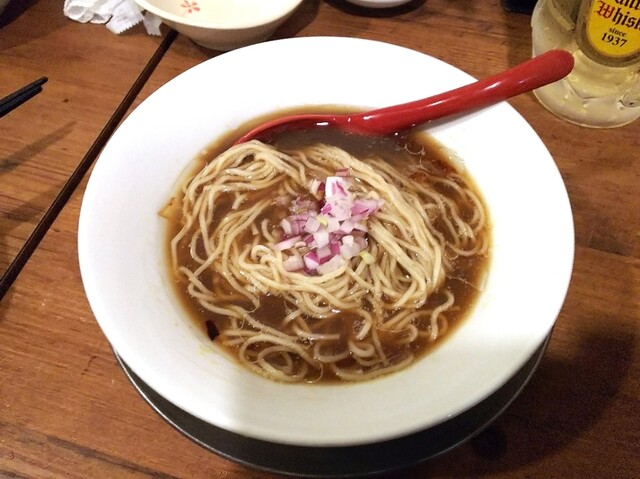 煮干しの旨味と香り全開のニボスープは嫌なエグミまったくなくほんのりビター感あり美味。今年初の冷やしラーメンでしたが、合間に冷やしがあるとすっきりしてリフレッシュにもなります。このスープ水筒に入れて夏場に作業したいです。麺は全粒粉入り細麺でパツンとした食感。具は紫玉葱。