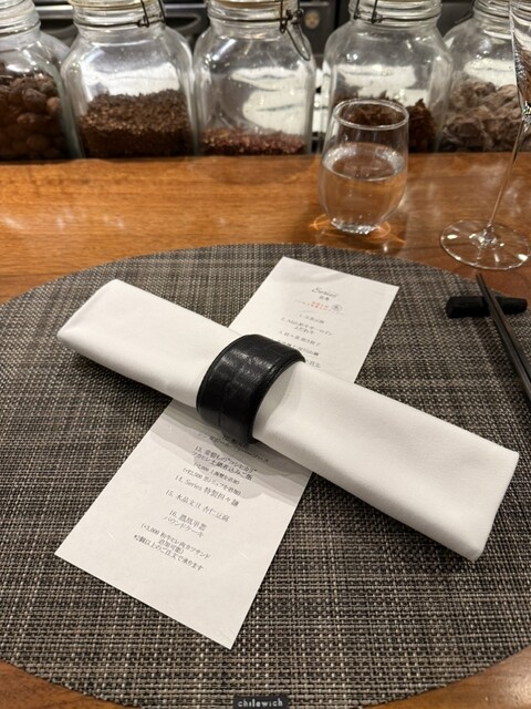席に座ると本日のコース概要が目に入る。Seriesの系列は皆「少量多品」をモチーフにしているらしく、ランチとしては圧巻の16品。そしてペアリングにもこだわりがあるようで、何人ものゲストがおすすめです、とコメントで記載していた。であるならば、とノンアルコールのペアリングを注文。追加料金でいくつかメニューを変更できるようだ。初めての訪問なのでそのままでお願いした。