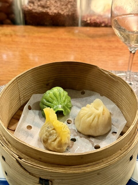 鶏肉・牛蒡(ごぼう)の蒸し餃子(手前の黄色)、春菊・海老の蒸し餃子(左上の緑色)、上海蟹の小籠包(右の白色)