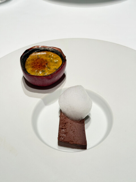 →ねっとりしたテリーヌを、パッションフルーツのソースでいただく。ソースはパッションフルーツの皮を器として用いており、表面がキャラメリゼされ、中には世界三大美果で名高いチェリモヤとパッションフルーツの種。酸味と甘味、芳醇な香りが相乗効果を生む。美味。