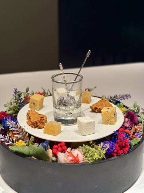 →ブリデガイロと呼ばれる南米で誕生日パーティーや結婚式などの祝い事に欠かせないスイーツをメインに添えている。生キャラメルのような濃厚でねっとりした食感と甘さが特徴。ピンでパクッと一口にいただく。