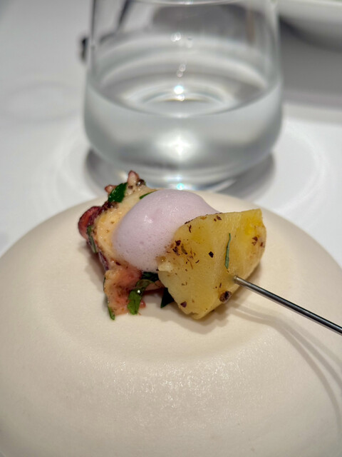 →蛸とジャガイモのローストをマリネ。蛸はボイル、ジャガイモはじっくりと蒸し焼きにしており、噛むと旨みが溢れてくる。ジャガイモはホクホクで甘みを感じる。外を軽くローストしており、焼き目が香ばしい。ムースがこれらに繋がりと一体感を生み、スパイスとハーブの香りが鼻に抜ける。本来出会うはずのない海と畑の食材たちが皿の上で出会い、意外なペアが新しい可能性を感じさせる。同じ食材を使い、全く異なるアプローチで調理することにより、食材の持つ魅力を存分に味わうことができる。美味。