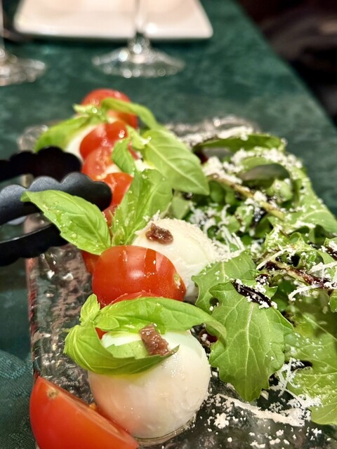 →新鮮で張りツヤのある朝採れの野菜たちをバルサミコ、ブラックペッパーで調節、グラナパダーノチーズを上から削る。モチモチで味の濃いモッツァレラとフレッシュなトマトの酸味が心地よい。