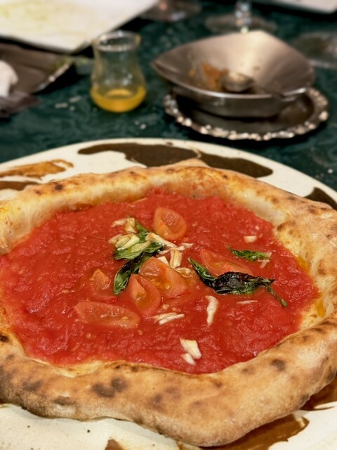 →トマト、ニンニク、バジル、オレガノ。生地があと僅かしかなく小さくなっても良いか、と聞かれたので構いませんと。程なくして小ぶり(直径15cmほど)のマリナーラがサーブされた。その後、森上オーナーがオレガノを揉んで振りかけてくださいました。ガツンとくるトマトとニンニクの旨さ、バジルの甘さを味わう。やはりオレガノはトマトと相性が良く、爽やかな香りが全体を引き締めてうまくまとめている。非常に美味。
