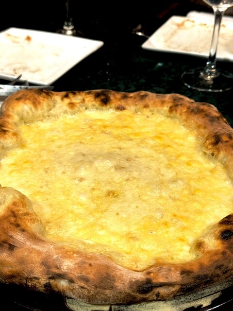 →マルゲリータの興奮も冷めやらぬまま次のピッツァを注文する。お次はフランス産ラクレットチーズをふんだんに使ったピッツァだ。熱々のピッツァが運ばれてきて、森上オーナーが取り分けてくださる。こぼれ落ちそうなピッツァを持ち上げて顔を近づけるとブワッとラクレットの芳醇な香ばしい香りが鼻から入り込んでくる。そのまま齧り付くと特濃のコクとドロリとした食感が襲いかかってくる。口いっぱいに幸せを噛み締めながら飲み込む。非常に美味。