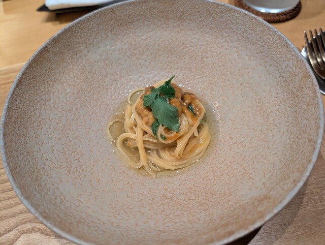 ◆ 紫ウニとセリのパスタ 梨を添えて