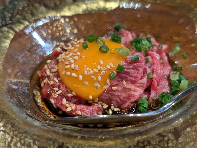 まず、前菜として登場したのは、美しいモモ肉のユッケ。濃厚な卵黄を絡めて口に運ぶと、とろけるような食感と肉の旨味が広がり、最初のひと口から心を掴まれました。