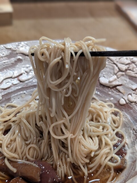 なんと、先ほどの蕎麦を今度は「平打ち」で。あえて氷水で締めず、少し温度を高めにすることで風味を豊かに。同じ蕎麦でも、切り方と温度でこれほどまでに表情が変わるのかと驚かされます。