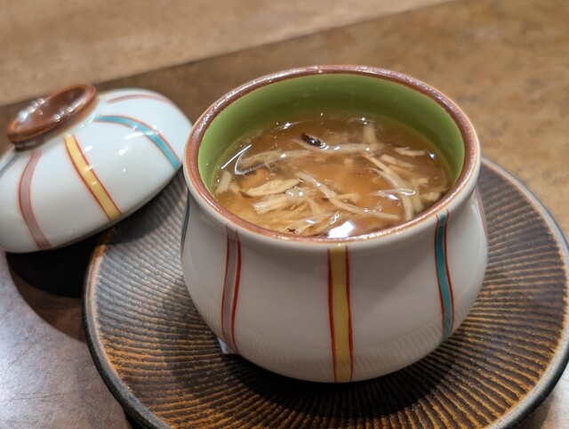 蓋を開けた瞬間に立ち上る、芳醇な香り。お出汁はなんと、鴨の骨ではなく身だけを贅沢に使った濃厚なもの。ふるふるとした卵液の中には、ふっくらとした鱧と秋の味覚の王様・松茸が。