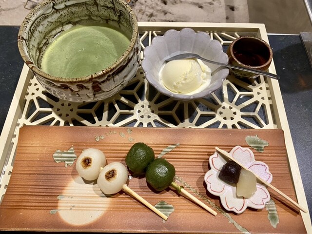 デザートは抹茶、バニラアイスにお団子がきました