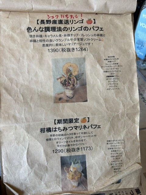 ■ 色んな調理法のリンゴのパフェ(税込1,390円) 長野県から直送されたリンゴを、焼き・キャラメル煮・チップ・フレッシュと、様々な調理法で表現した一品。 異なる食感と風味のリンゴが自家製ソフトクリームと溶け合い、見事なマリアージュを創り出しています。シェフが自信を持って推奨するのも納得の完成度でした。