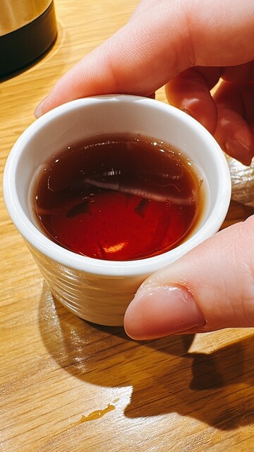 まぜそばの提供前に、お猪口サイズの温かいお出汁スープを出してくださるのですが、これは飲み干さずに残しておくのがおすすめです。
