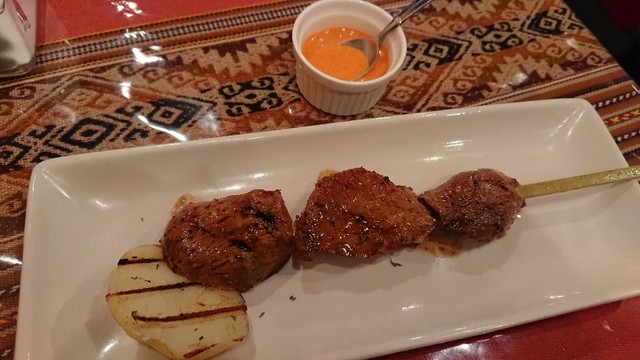 牛ハツのバーベキュー。焼き加減も丁度よかったです。アヒ(唐辛子のソース)を付けて食べるとさらに美味しい。