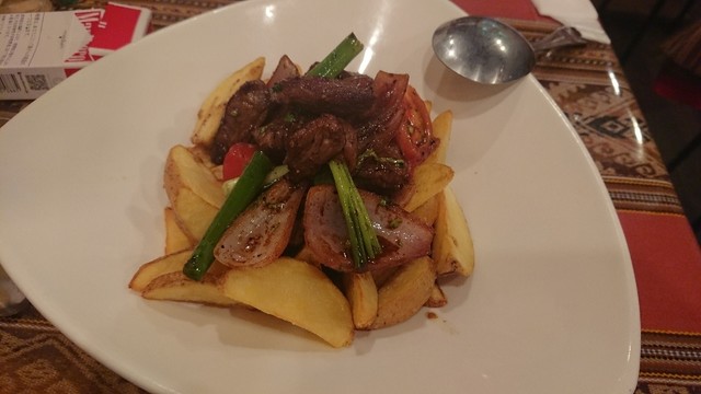 牛肉・ポテトフライ・紫玉ねぎ・トマトの炒め物。ライスつき。醤油ベースの炒め物で日本人にも馴染みのある味かも。美味しかったです。