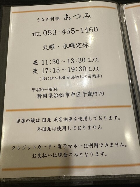 【うなぎ料理 あつみ】