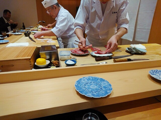 店内はカウンター11席とテーブル席が3つで、以前のお店よりも明るく、スタッフの数も多いので、活気がある印象です。そして席に案内されると・・・森田さんが・・・いました!!最後にお会いしてから4年ぶり♪以前同様、我々の目の高さにまな板があるので、森田さんの手元・お仕事ぶりに皆さんの視線が集中してます♪