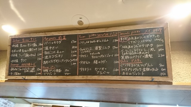料理は種類を限定し、バケットやパスタに至るまで全て自家製♪注文はアラカルトで、その日のメニューは頭上の黒板に書かれており、左から【加工肉系】【前菜】【パスタ・リゾット】【肉料理・ドルチェ】と並んでいるので、順に頼むとコース仕立てで頂けます。当然ながら、肉料理は品によって、火入れに時間がかかるので早めに注文しておきましょう。