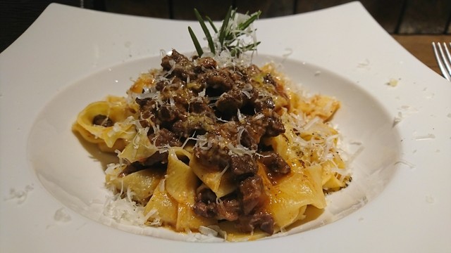 …以前も頂いたのですが、かなり良かったので再度注文。猪はしっかりと煮込まれて臭みも無く、旨みが濃厚♪このソースに幅広のタリアテッレが良く絡まり、味も量も満足な一品♪夜中にこれだけ食べに来たい♪