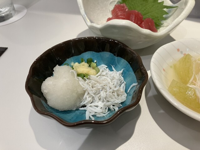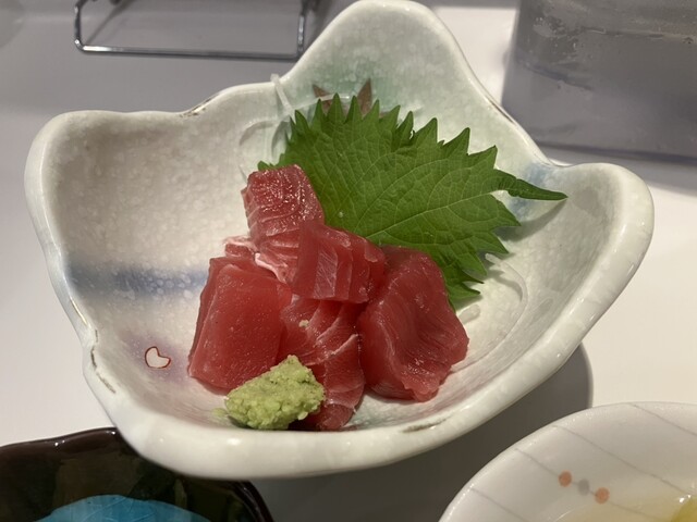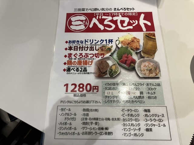 ドリンク+日替り付き出し+まぐろぶつ+鶏唐+選べる2品で、なんと税込1,280円也!