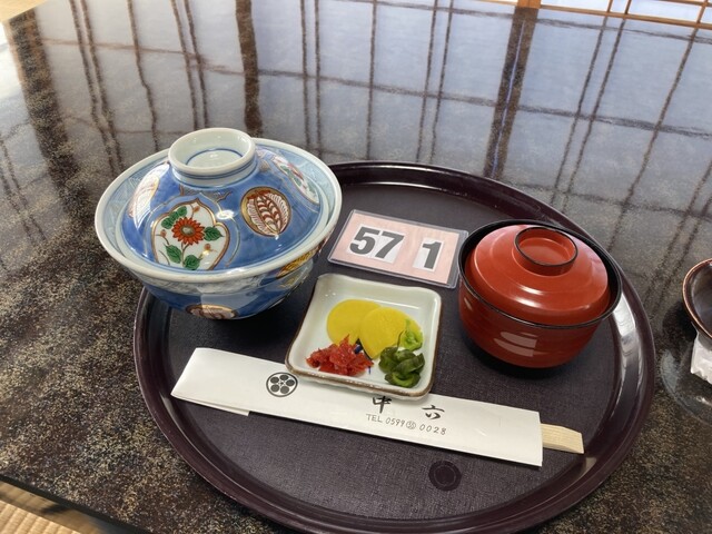 志摩市磯部町上之郷、伊雑宮の目の前にある登録有形文化財の料理旅館 中六。趣のある佇まい。メニューはうなぎ丼のみ三切れ四切れ五切れの三種から四切れを注文。全て肝吸い付きです。見た目の濃い少し甘めのタレがご飯の奥まで染みてる皮はパリパリ身は柔らかく分厚い。巨大な肝が浮かぶ肝吸いは丁度良い味加減。四切れでも食べごたえ充分。そしてお値打ち!コスパ最高!