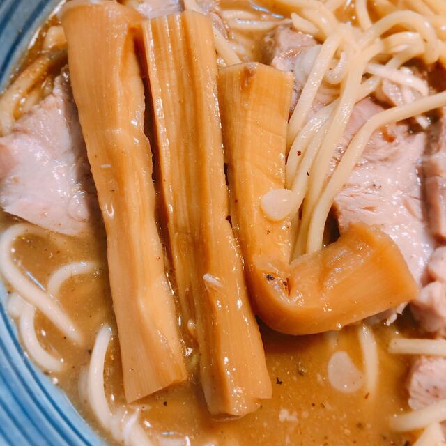 麺はツルツルモチモチで、豚チャーシューは箸で崩せるほどにしっとり柔らかく、大きなカットのメンマはコリコリと歯切れが良い。