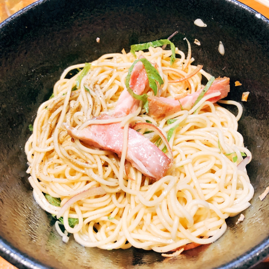 トッピングは、レアチャーシュー2種がしっとりと美味しい上に、フライドオニオンでパンチが加わり、大葉、ミョウガ、赤玉葱で清涼感を出してくれています。