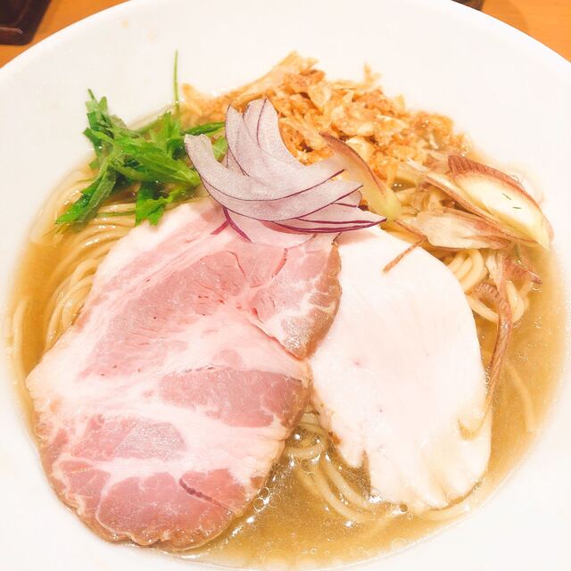 トッピングの鶏と豚のレアチャーシューは素晴らしいですが、フライドオニオン、紫蘇、茗荷も良いアクセントになっています。
