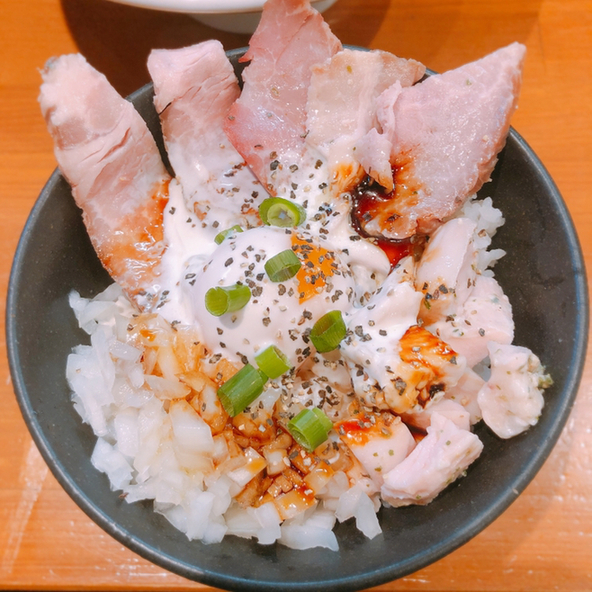 チャーシューと卵黄の上にヨーグルトとマヨネーズからなる特製ソースが綺麗にかけられて、葱と粗挽き胡椒が少々振りかけられています。