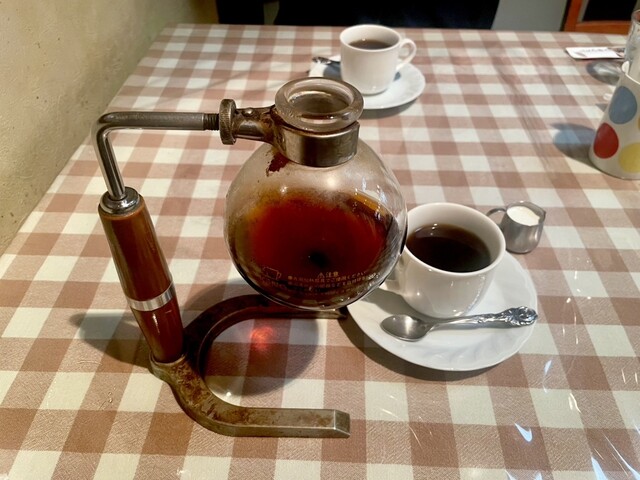 カウンターで豆を挽き、サイフォンで淹れていますが、提供はカップです