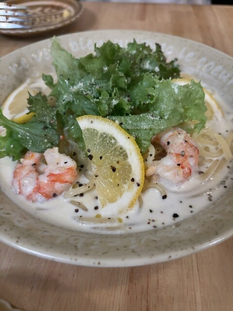 ●自家製モッツァレラと水牛モッツァレラのDOC、半熟卵のポテトサラダ、海老と国産レモンのクリームパスタ