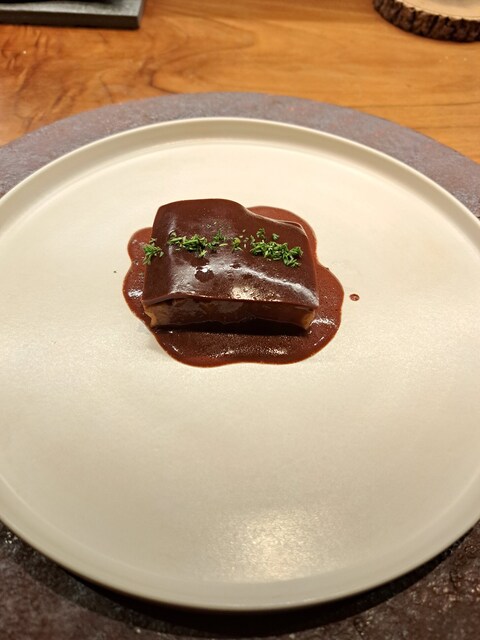 ♦豚肉の煮込み 豚肉にはカカオのソースが乗せられており、見た目も香りもスイーツのようです。ビールで煮込まれたお肉はとっても柔らかく、ソースとのバランスが素晴しい
