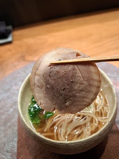 ♦名物〆のラーメン:雉や鴨から抽出した出汁がベースなので、単なる鶏系の淡麗な味わいではなく、力強い野性味あふれるスープでした 鹿と猪のチャーシューが旨すぎて言葉が出ない・・・・