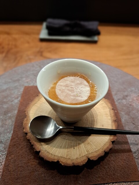 ♦カブとジビエのコンソメ とても良い香りと、コンソメジュレの琥珀色美しい 表面にカブのムースが乗せてあります。