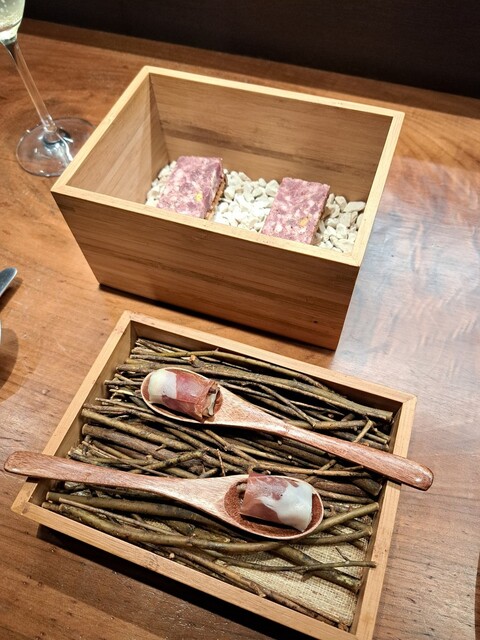 ♦生ハムとパテドカンパーニュ 器が店のコンセプトを物語っており、シェフの世界観に一気に引き込まれます。シェフ自身が狩った肉で拵えた生ハムで同じく鹿肉と椎茸を包んであります。生ハムも塩味が抑えられていて、とてもバランスが良く美味しい。 パテドカンパーニュは、猪と鹿肉で仕込まれていて、奥が深い味わいとなっています。