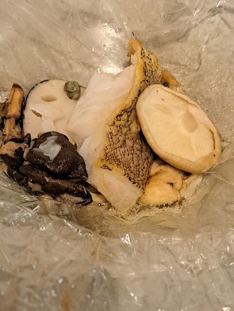 ♦由比産のハタと、キノコのカルトッチョ 紙ではなく透明なクッキングラップで包まれてオーブンで焼かれて提供されます カルタ・ファタのクッキングラップは1本6000円程と高価らしいですが、、 直火以外で230℃の耐熱性があり、素材を包み焼きすると旨味や香りが封じ込められたまま提供できとても便利そう♬ 封を開けた瞬間にフワッと抜群な香りがします♬ 具材は、鯛とキノコ類で出汁とバターの風味が程良く美味しい