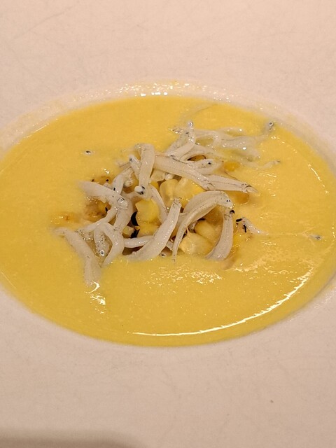 ♦トウモロコシの冷製スープ ゴールドラッシュを使用しており、とても甘く旨味も凝縮されてます トッピングのシラスの程良い塩味が良いアクセントになっていてとても美味しい