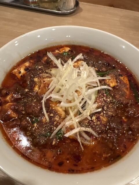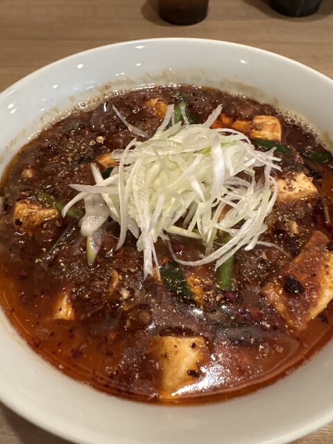 優しい煮干し味噌スープの上にラー油たっぷりの四川麻婆豆腐が乗ります!