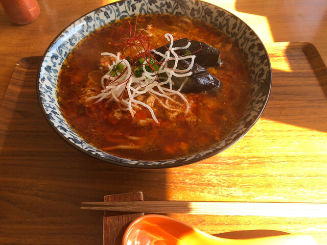 真っ赤なスープにたっぷりの鶏挽肉、揚げ浸しの茄子、ネギと糸唐辛子、揚げ春雨が乗ってます。