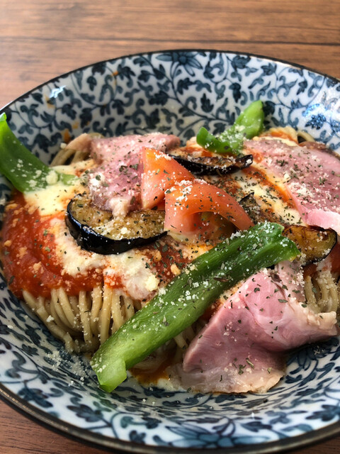 たっぷりのとろけたチーズソースの上に豚チャーシューがたっぷり5枚!生のトマト、ピーマン、オリーブが乗ってます。さらに乾燥バジルがふりかけられてます。